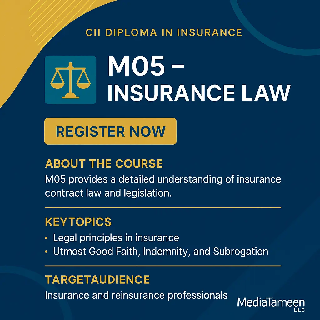 📚 نبذة عن المادة: تُعد مادة M05 من أهم المقررات في مسار الدبلوم المهني في التأمين (Diploma in Insurance) الصادر عن المعهد البريطاني للتأمين CII، حيث تقدم للدارسين فهماً عميقاً للأسس القانونية التي يقوم عليها عقد التأمين، وأبرز التشريعات التي تحكم العلاقة بين المؤمن والمؤمن له.