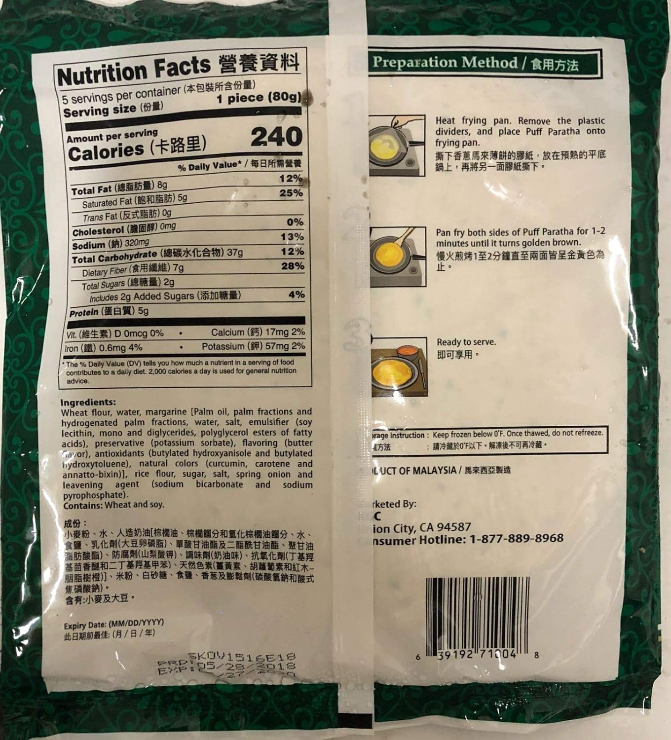 Raya Puff Paratha Asian Pancakes - 14.1oz (400g) Combo Pack contains: 3 Spring Onion Flavor and 3 Original Flavor Suitable for conventional oven and frying pan - contains 5pcs. Product of Malaysia.