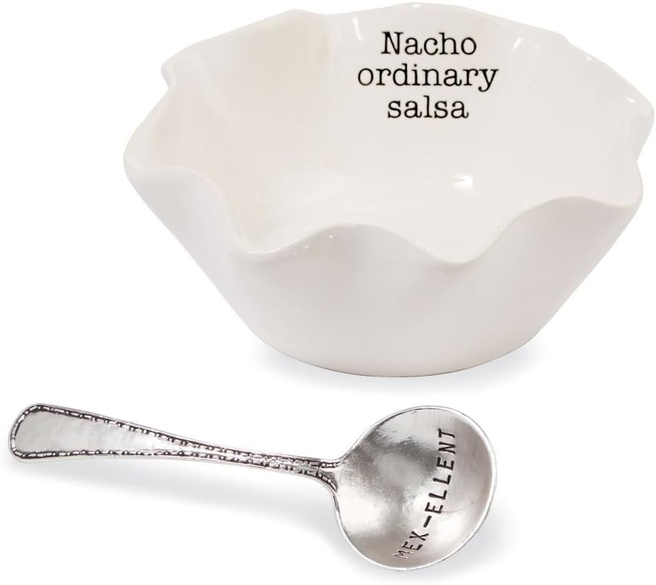 2-Piece set. Ceramic dip cup features ruffled "tortilla shell" Shape and "Nacho ordinary Salsa" Sentiment on interior rim. Arrives with "mix-excellent" Stamped silver plate ladle. Cup 2" X 5. 5" Diameter, ladle 5".