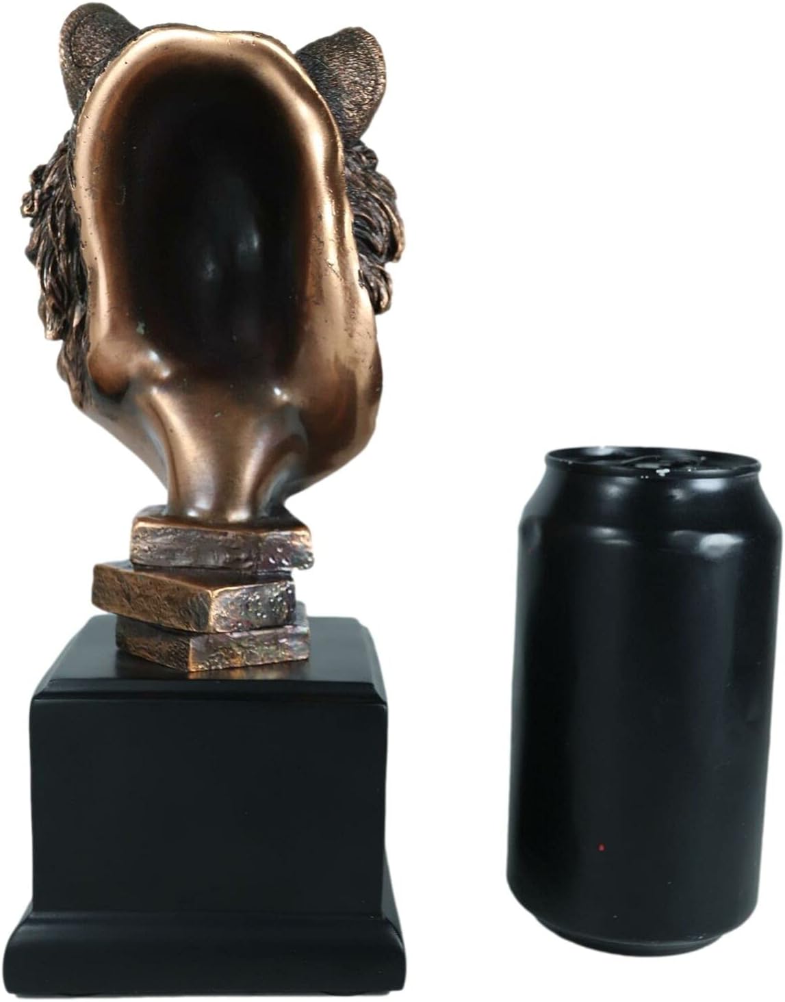 This Exotic Bengal Tiger Bust figurine with its base measures 9" tall, 4" long and 3.5" deep. It weighs about 1.75 pounds. The base alone measures 3" High and 3.5" Wide. This Exotic Bengal Tiger Bust figurine is made of the highest quality resin, undergoing the process of bronze electroplating giving it a uniform shine on the inside as well as the surface of the figurine. To add sculptural aesthetics and display worthiness, we add accent faux black wooden base to the sculpture. Marked as a fierce, merciless and efficient predator, this large wild cat is a beast to display at your room. With his sharp eyes staring at you, this tiger bust is quite a testament of nature's food cycle and circle of life. Props in photos are not included with the item.