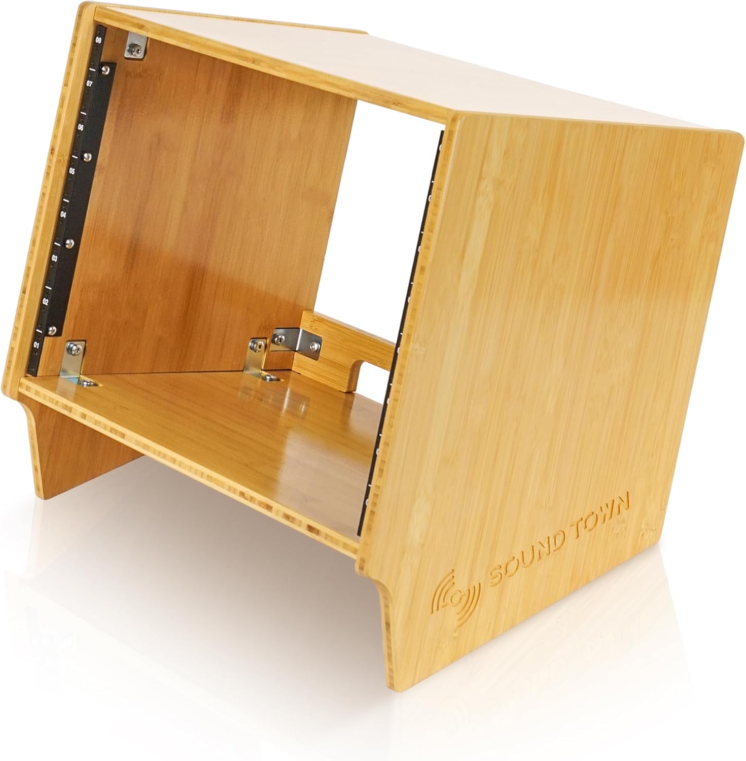 Sound Town DIY 8U Angled Desktop Turret Studio Rack, Solid Carbonized Bamboo, Assembly Required (STBR-8SL) Introducing the Sound Town STBR-8SL 8U carbonized bamboo studio rack case, built with compactness, style, and efficiency in mind. The 20° slanted turret design of the STBR-8SL rack case allows for a more ergonomic operation of your equipment. Crafted with 15mm thick, premium solid carbonized bamboo, the STBR-8SL provides long-lasting durability and protection while adding a touch of style. Designed to maximize your studio space, the STBR-8SL accommodates standardized 19“ width and 14” of depth, ensuring your equipment is organized without taking up excess room.Assembling the Sound Town STBR-8SL is quick and easy, thanks to its pre-cut components that ensure a straightforward DIY experience. The hassle-free setup is further simplified with pre-installed rack rails and 10/32 rack rail screws, to quickly and conveniently install your studio equipment. Dual rear cable passthrough cutouts significantly improve cable management, allowing your workspace to be neat and organized.With its blend of functional design, ease of assembly, and robust construction, the Sound Town STBR-8SL studio rack is the ideal choice for professionals seeking to optimize their studio environment while ensuring their gear remains secure and accessible.